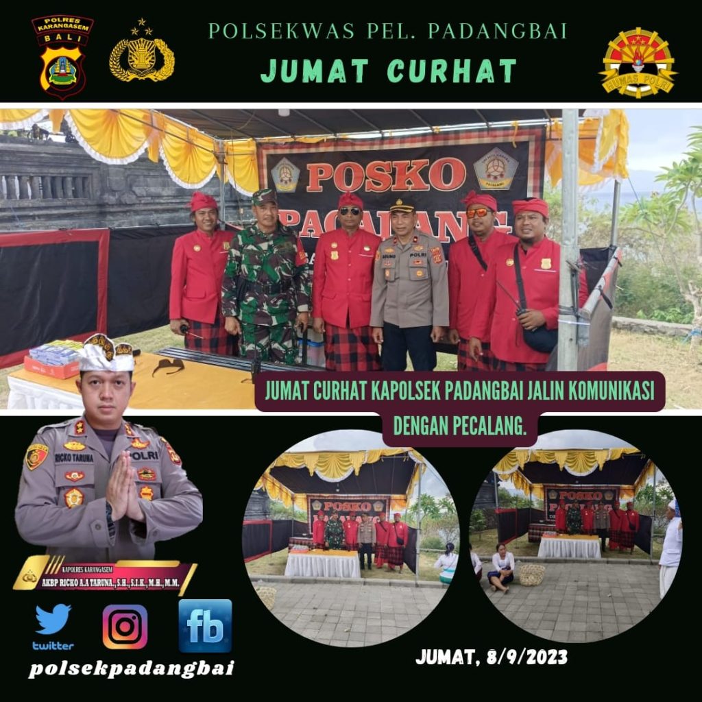 Dalam menindaklanjuti program prioritas tersebut Kapolsek Kawasan Pelabuhan Padangbai, Kompol A. A Ngurah Agung, S. H., melaksanakan Jum’at Curhat bersama anggota Pecalang Desa Adat Padangbai bertempat di areal Pura Silayukti, Jumat (08/09/23 ) pagi.