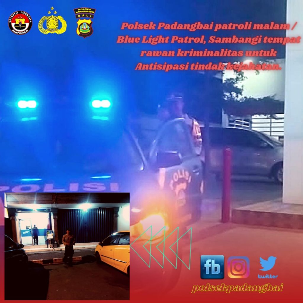 Dalam rangka pelaksanaan giat Blue Light Patrol / Patroli malam Personil Polsek Padangbai dalam kegiatan rutin yang di tingkatkan untuk menciptakan situasi kondusif sebagai Program Pemantapan Harkamtibmas di wilayah Hukum Polsek Kawasan Pelabuhan Padangbai.