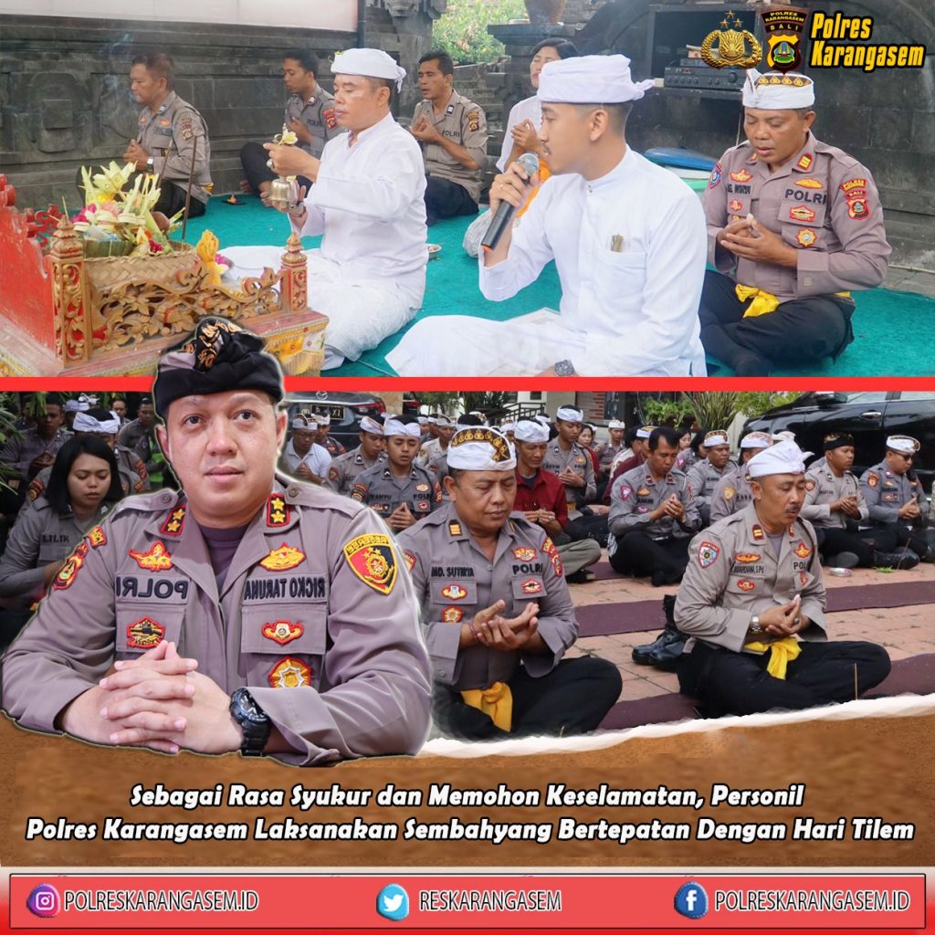 Persembahyangan bersama yang dilakukan Personil Polres Karangasem yang beragama Hindu merupakan kegiatan rutin yang di laksanakan. Seperti hari ini yang bertepatan dengan hari raya “Tilem” Kamis (14/09/2023) jam 08.30 wita bertempat di Pura Padmasana Giri Bhuana Polres Karangasem.