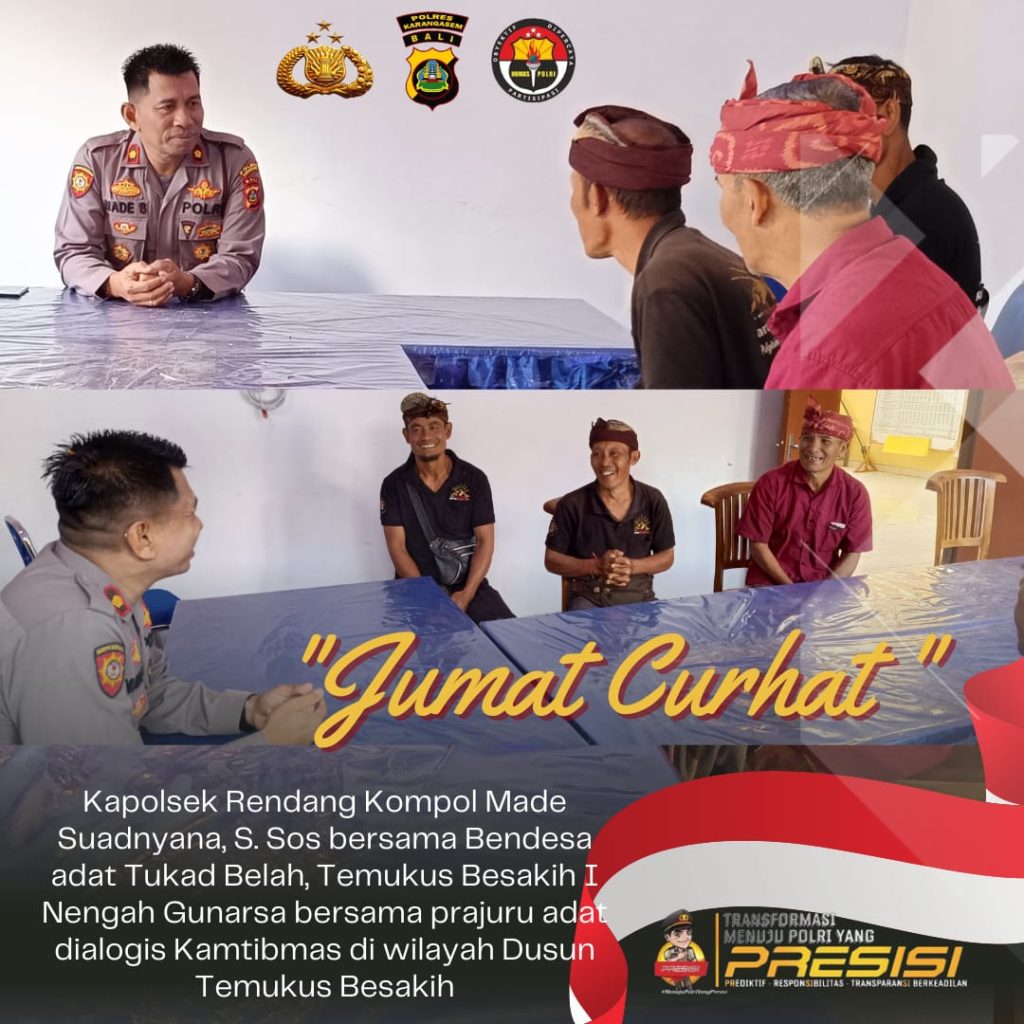 Program Kapolri dengan tema ‘Jum’at Curhat’ merupakan bagian dari program Kepolisian , Kapolsek Rendang Kompol Made Suadnyana, S.Sos., turun langsung ke masyarakat untuk menyerap informasi , saran dan keluhan di masyarakat berdialogis dengan Bendesa Adat Tukad Belah I Nengah Gunarsa, Dusun Temukus Desa Besakih, kamis (28/9/2023)