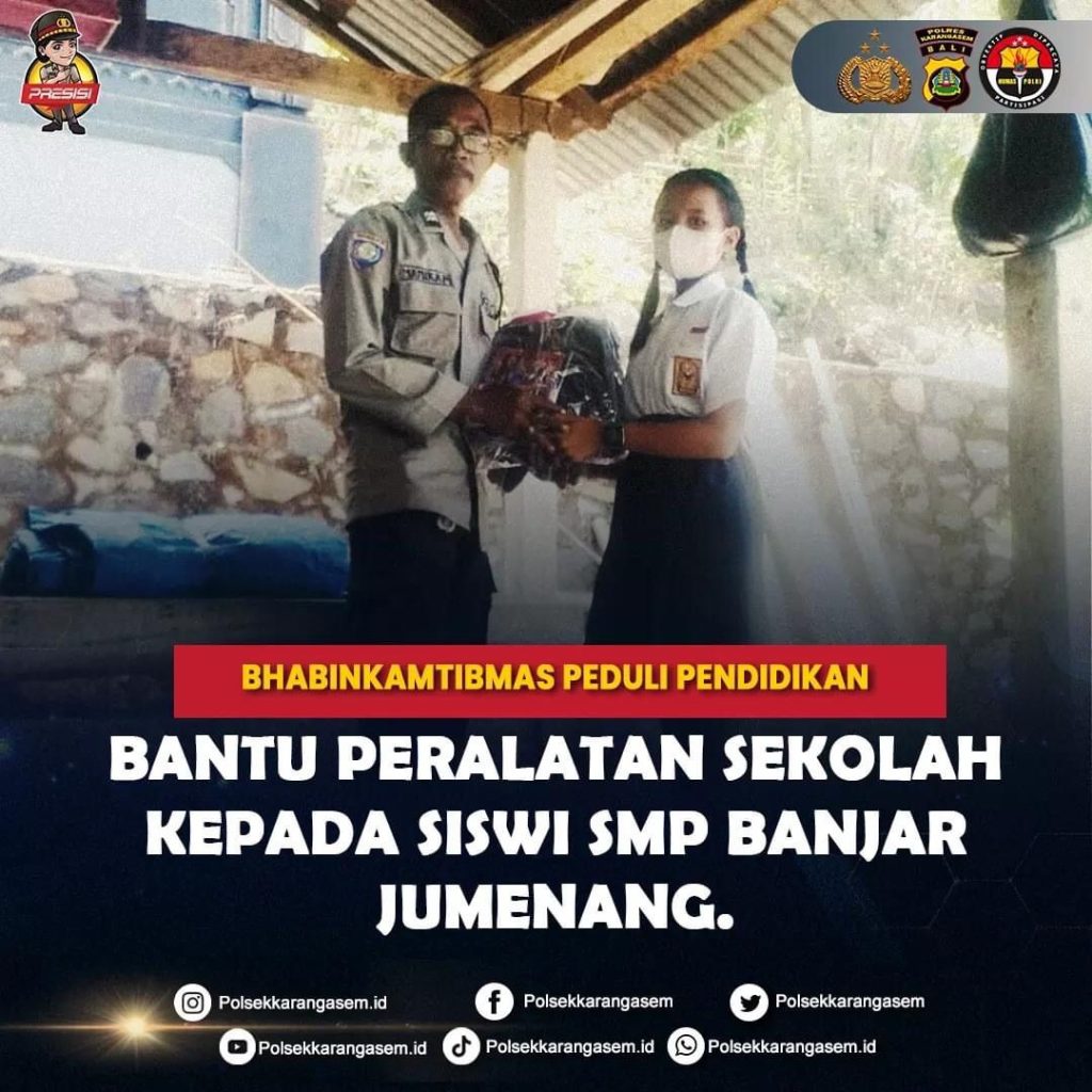 Bhabinkamtibmas Desa Bukit Aiptu I Wayan Pinda Manikam menyalurkan bantuan sosial berupa buku dan peralatan tulis serta tas sekolah kepada siswi kurang mampu di Banjar Jumenang, Desa Bukit.