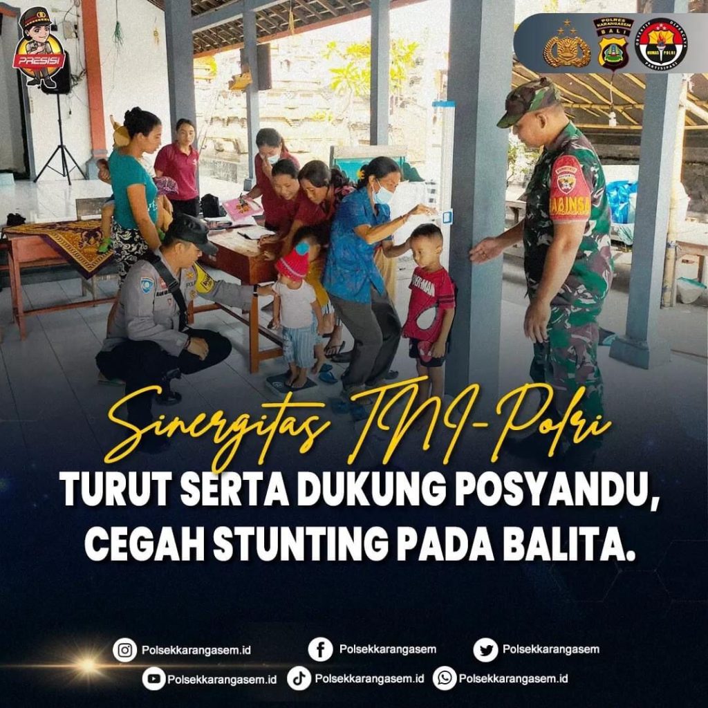 Bhabinkamtibmas Kelurahan Padangkerta Aiptu I Komang Ada Sudarsana bersinergi dengan Babinsa turut serta membantu dalam kegiatan Posyandu di Banjar Dinas Dukuh, Kelurahan Padangkerta.