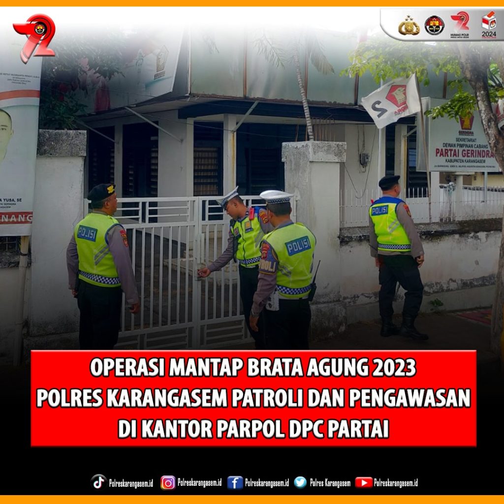 Personil jajaran Polres Karangasem dalam rangka Operasi Mantap Brata Agung 2023 di Daerah Hukum Polres Karangasem melalui Kasatgas II (Preventif) AKP I Made Sudihartama, S.H., beserta personil yang terlibat Operasi Mantap Brata Agung 2023 melaksanakan patroli, pengaturan, pengawasan, penjagaan, dan himbauan depan Kantor DPC Gerindra Karangasem bertempat di Kantor DPC Partai Gerindra, Jalan Bhayangkara, Amlapura, Karangasem. Jum’at (20/10/2023)