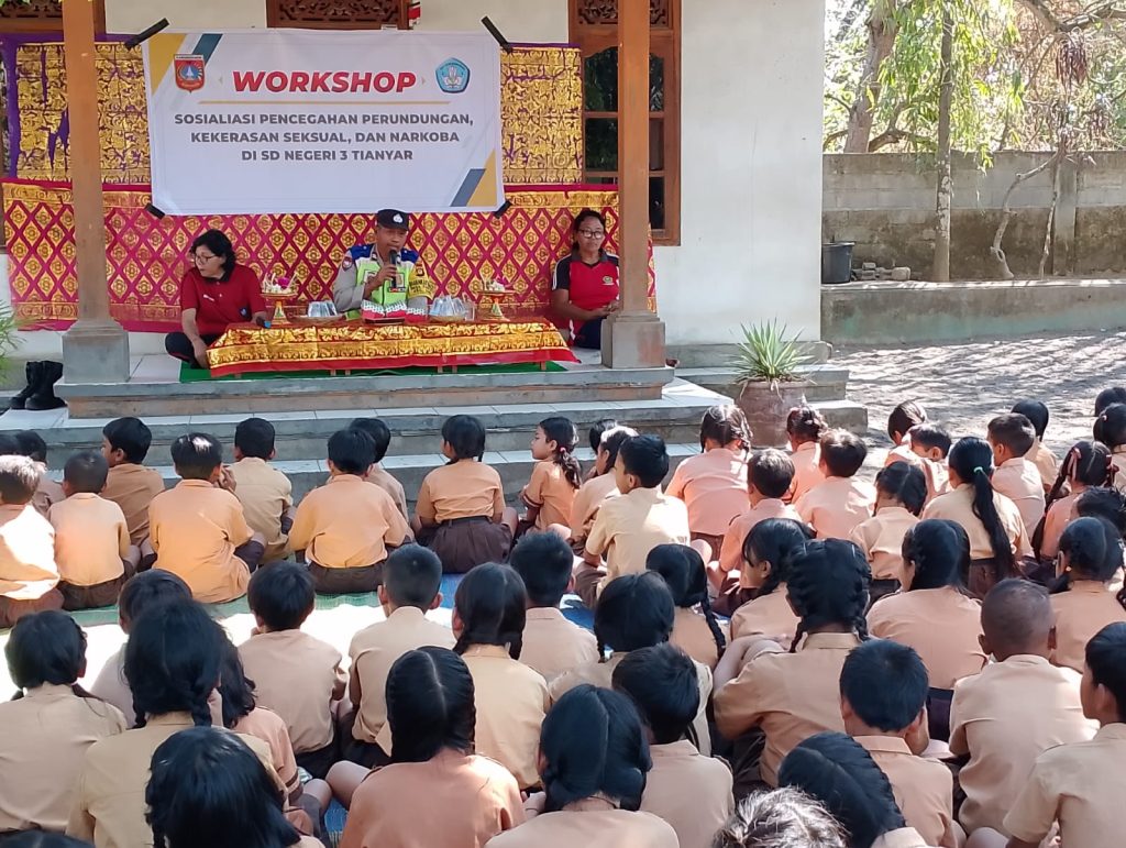 Polsek Kubu Bhabinkamtibmas Desa Tianyar Timur Aiptu I Nyoman Tusan menghadiri giat workshop disekolah menjadi narasumber dalam memberikan pembinaan /sosialisasi terkait Pencegahan Perundungan, Pelecehan seksual dan Narkoba kepada pelajar di sekolah SD Negeri 3 Tianyar, Desa Tianyar Kubu Karangasem, Jum’at (20/10/2023).