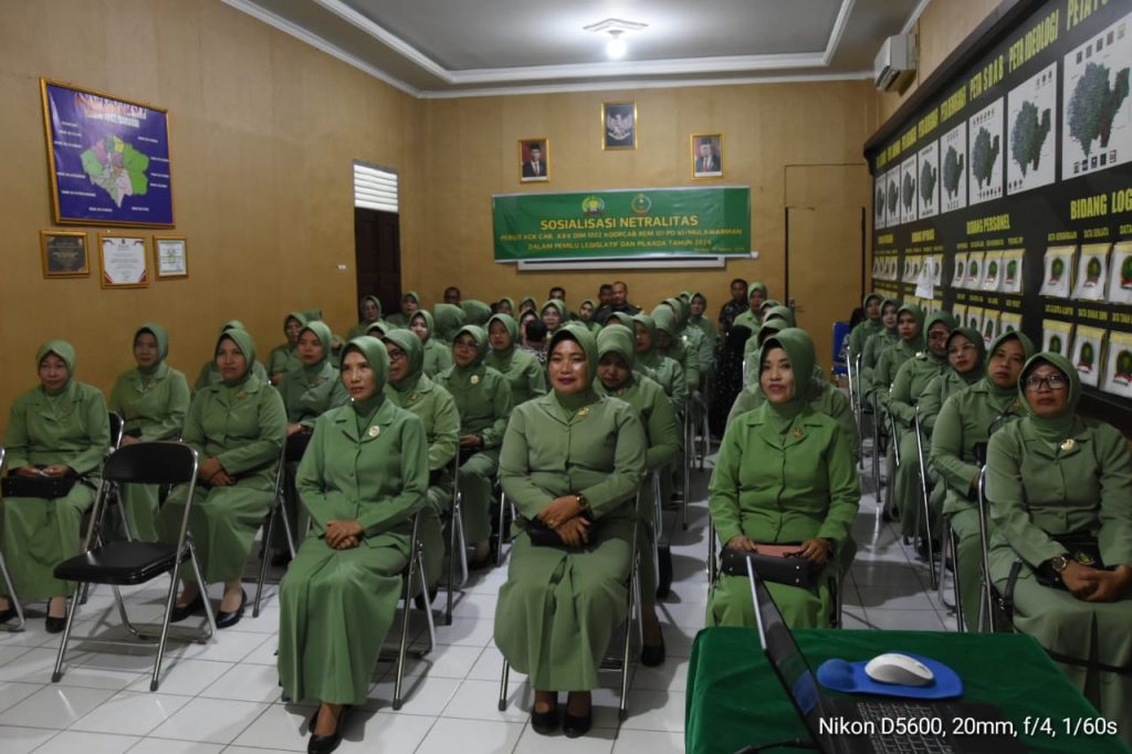 BARABAI, (perskpknews.com). -Guna mendukung netralitas TNI pada Pemilu Tahun 2024, Dandim 1002/HST Letkol Inf Fery Perbawa.S.Hub.Int.M.Han, didampingi Ketua Persit KCK Cabang XXV Dim 1002 Ny. Maulida Fery Perbawa, memberikan sosialisasi kepada Persit Kartika Chandra Kirana Cabang XXV Dim 1002 Koorcab Rem 101 PD VI/Mulawarman.