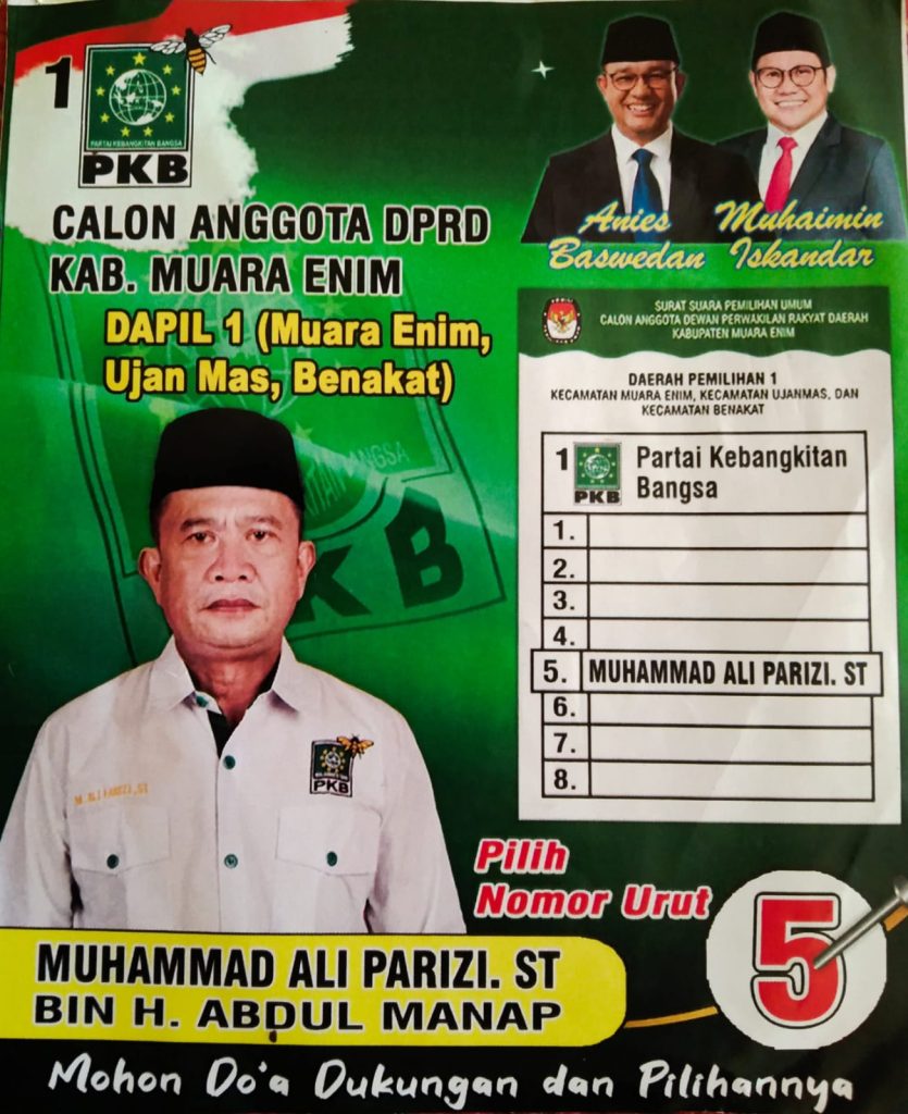 MUARA ENIM – Melalui Partai Kebangkitan Bangsa (PKB) M.Ali Parizi ST. mencalonkan Diri sebagai calon anggota DPRD Dapil Satu kabupaten Muara Enim dengan no urut 05