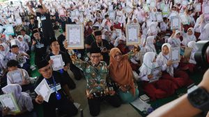 KAB. BANDUNG – Sebanyak 38.300 peserta dari kalangan guru ngaji, siswa-siswi, ASN Pemkab Bandung, TNI, Polri, kader PKK, para camat, Organisasi Perangkat Daerah, Ormas/OKP serta pihak lainnya di Kabupaten Bandung mengikuti Gerakan Menulis Al-Qur’an (Gelisan). Gelisan ini pecahkan Rekor MURI (Museum Rekor Dunia Indonesia) dengan kategori menulis Al-Qur’an terbanyak di Indonesia, Sabtu (25/5/2024).