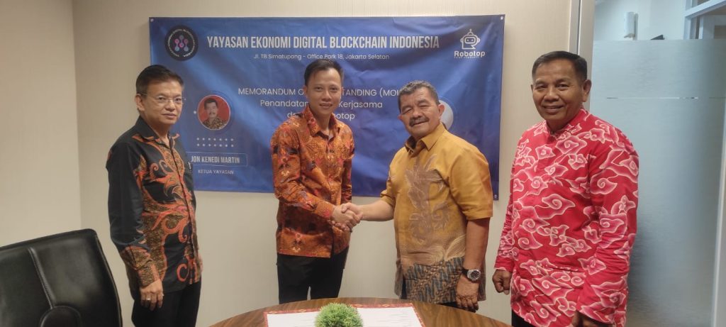 **Jakarta, Jumat –** Dalam langkah strategis untuk memajukan pengetahuan masyarakat Indonesia tentang ekonomi digital, Jon Kenedi, bersama dengan Edy Sugianto, co-founder ROBOTOP, dan Mathias Putra sebagai tim ahli ROBOTOP, menandatangani Memorandum of Understanding (MoU) dengan komunitas ROBOTOP Indonesia. Acara yang berlangsung pada hari Jumat kemarin di kantor Yayasan Ekonomi Digital Blockchain Indonesia, Jalan TB Simatupang, Jakarta, turut dihadiri oleh Sekretaris Yayasan, Bugi Subekti, dan Pembina Yayasan, Azwar Dahlan.