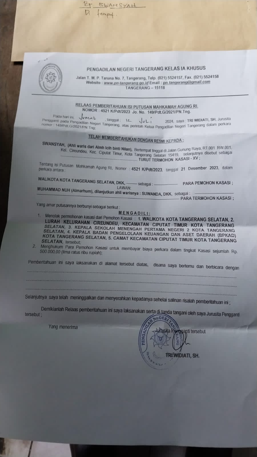 Diketahui, ahli waris telah melalui proses hukum yang panjang hingga akhirnya memenangkan sengketa tanah ini di tingkat kasasi. Kini, mereka menunggu tindakan lebih lanjut dari Pemkot Tangsel untuk menindaklanjuti putusan tersebut.