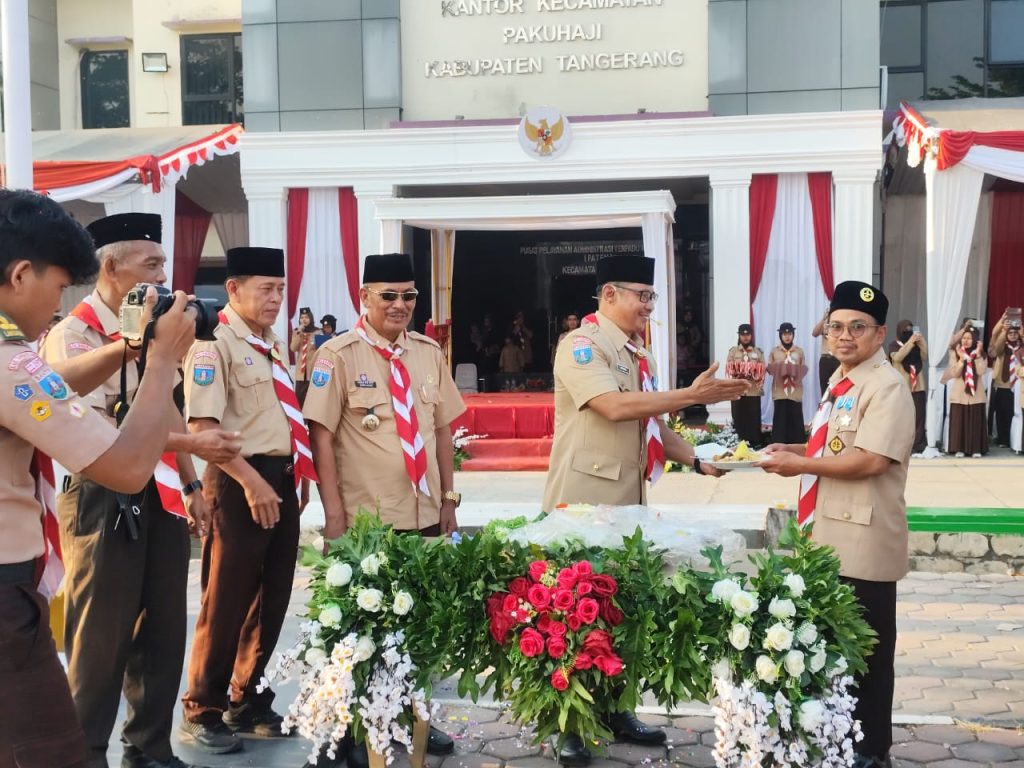 Camat Pakuhaji memimpin upacara dalam peringatan Hari Ulang Tahun (HUT) Pramuka ke-63, Kwartir Ranting Gerakan Pramuka Pakuhaji, bertempat di halaman Kantor Camat Pakuhaji. Pada Minggu (18/8/2024)