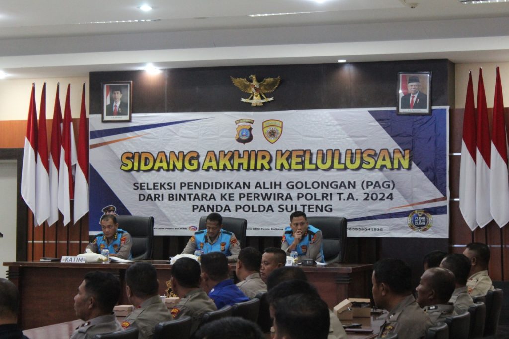 Palu,perskpknews.com – Kepala Kepolisian Daerah (Kapolda) Sulawesi Tengah (Sulteng) Irjen Pol Dr Agus Nugroho, S.I.K, S.H., M.H., diwakili Kepala Biro (Karo) Sumber Daya Manusia (SDM) Kombes Pol Heru Budi Prasetyo, S.I.K menghadiri sekaligus memimpin Sidang Kelulusan Akhir Tingkat Panda Seleksi Pendidikan Alih Golongan (PAG) dari Bintara ke Perwira Polri Tahun Anggaran (T.A) 2024, Jumat 13 September 2024 pagi,