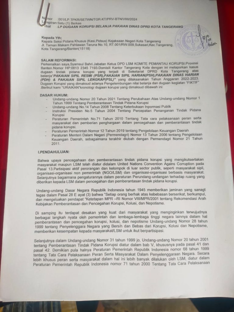 Selasa 17 September 2024 sekira pukul 14.30 WIB,Ketua DPD Lembaga Swadaya Masyarakat KOMITE PEMANTAU KORUPSI Provinsi Banten,Syamsul Bahri menyambangi kantor Kejaksaan Negeri Kota Tangerang,melaporkan atas kasus dugaan tindak pidana korupsi pembelian pakaian dinas dan atribut Ketua dan anggota DPRD Kota Tangerang yang dibiayai APBD Kota Tangerang Tahun Anggaran 2022-2023.