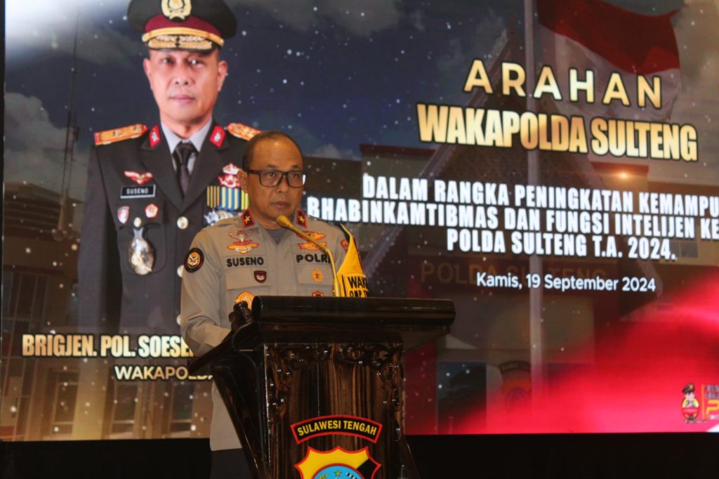 Palu,perskpknews.com – Kepala Kepolisian Daerah (Kapolda) Sulawesi Tengah (Sulteng) Irjen Pol Dr Agus Nugroho, S.I.K., S.H., M.H diwakili Wakapolda Brigjen Pol Soeseno Noerhandoko, S.I.K menghadiri sekaligus membuka kegiatan peningkatan kemampuan (katpuan) Bhabinkamtibmas dan fungsi Intelijen Keamanan (Intelkam) jajaran Polda Sulteng, Kamis 19 September 2024 di Sriti Convention Hall, Palu.