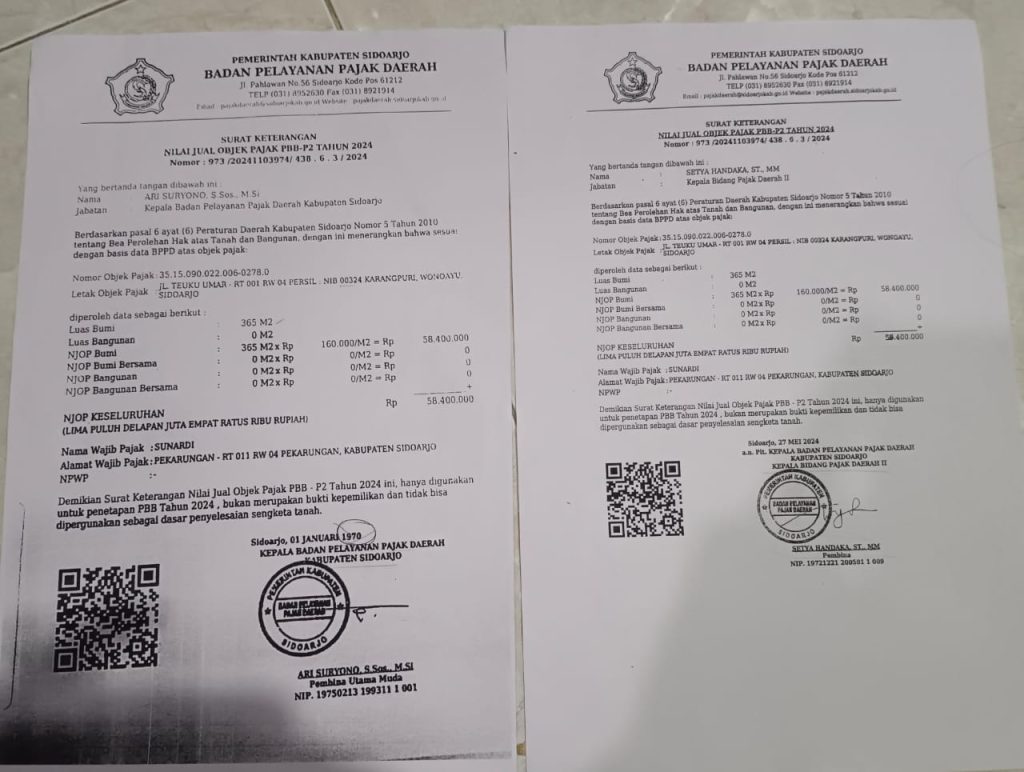PERS KPK NEWS – Dengan ditemukannya Surat keterangan NJOP PBB-P2 tahun 2024, dengan Nomer: 973/20241103974/438.6.3/2024, yang ditandatangani oleh Ari Suryono S. Sos, M. Si. dengan Jabatan: Kepala Badan Pelayanan Pajak Daerah Kabupaten Sidoarjo, yang ditandatangani pada pada tanggal Sidoarjo 1 Januari 1970.