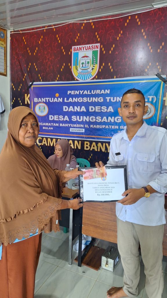 Banyuasin, 14 Desember 2024 – Pemerintah Desa Sungsang II, Kecamatan Banyuasin II, Kabupaten Banyuasin, Sumatera Selatan, kembali menyalurkan Bantuan Langsung Tunai (BLT) kepada masyarakat yang sudah terdata dan dianggap layak menerima. Bantuan ini diberikan pada 12 Desember 2024 sebesar Rp300 ribu per Keluarga Penerima Manfaat (KPM) setiap bulannya.