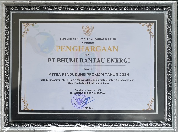 Penghargaan dari Pemprov Kalsel melalui Dinas Lingkungan Hidup yang diterima PT BRE kali ini sebagai Mitra Pendukung Proklim Tahun 2024.