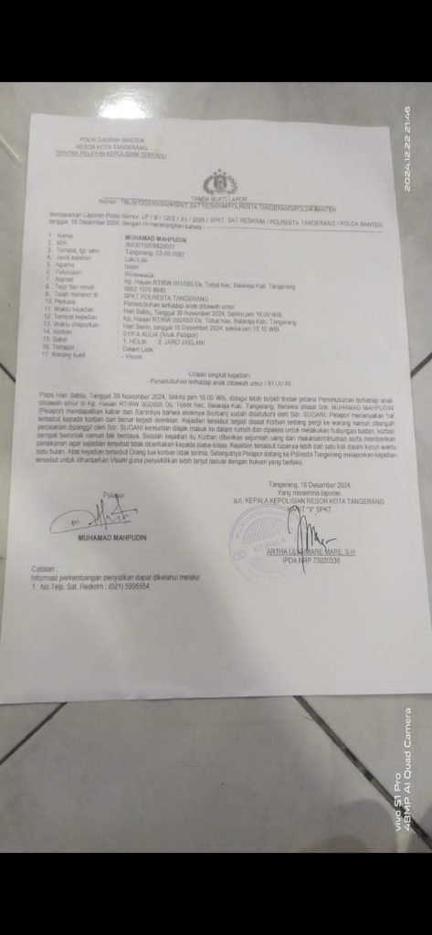 Meski pelaku meminta kasus ini tidak disebarluaskan, keluarga korban tetap memilih jalur hukum. Laporan resmi telah diajukan ke Polres Tangerang dengan nomor LP/B/1202/XII/2024/SPKT.