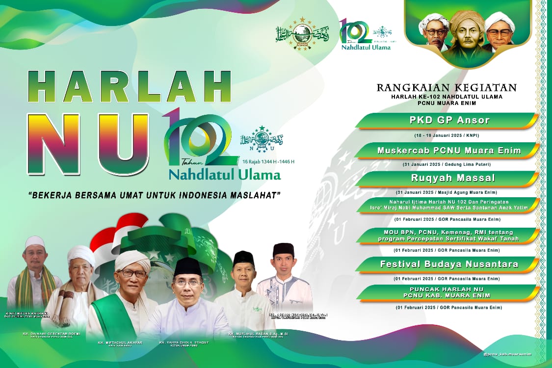 Muara Enim, Jelang Harlah Nahdhatul Ulama (NU) yang ke 102, PCNU Kabupaten Muara Enim melaksanakan rangkaian acara yang di mulai pada tanggal 18 Januari 2025 dengan Seminar Kebangsaan, giat PKD GP Anshor, selanjutnya Muskercab PCNU Muara Enim, Ruqyah Massal, dan Pucak Harlah akan dilaksanakan Pada Tanggal 1 Februari 2025, dengan rangkaian acara, Naharul Ijtima Harlah NU 102 dan Peringatan Isro ‘ Miraj, MoU BPN, PCNU, Kemeneg, RMI tentang sertifikat wakaf Tanah, dan Festival Budaya Nusanatara. (27/01/25).