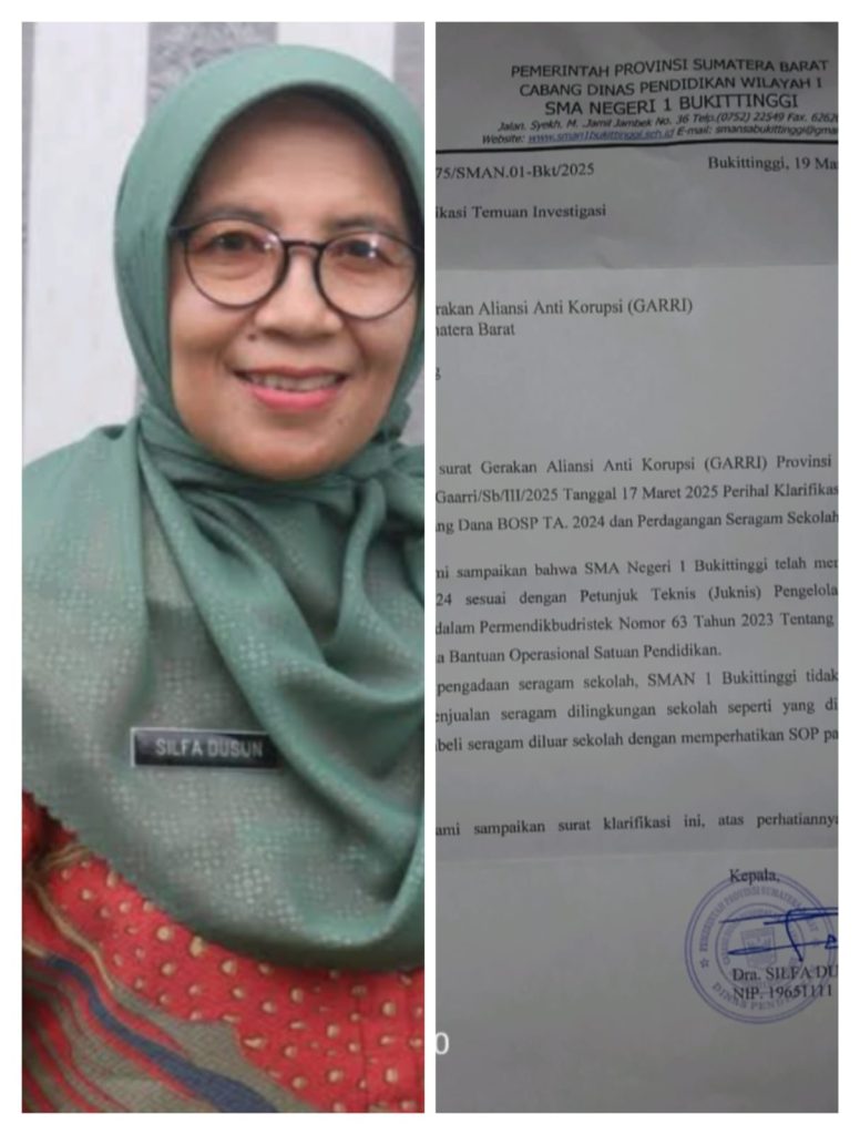 Kemudian kita (GARRI) juga mempertanyakan dalam surat klarifikasi tersebut, bahwa adanya permainan monopoli bisnis seragam sekolah saat PPDB. Dalam surat yang di jawab oleh Kepsek SMAN.1 Bukittinggi pada tanggal 19 Maret 2025 ia mengatakan tidak ada melakukan penjualan seragam sekolah. Hal itu sangat bohong besar di sampaikan oleh Kepsek tersebut.