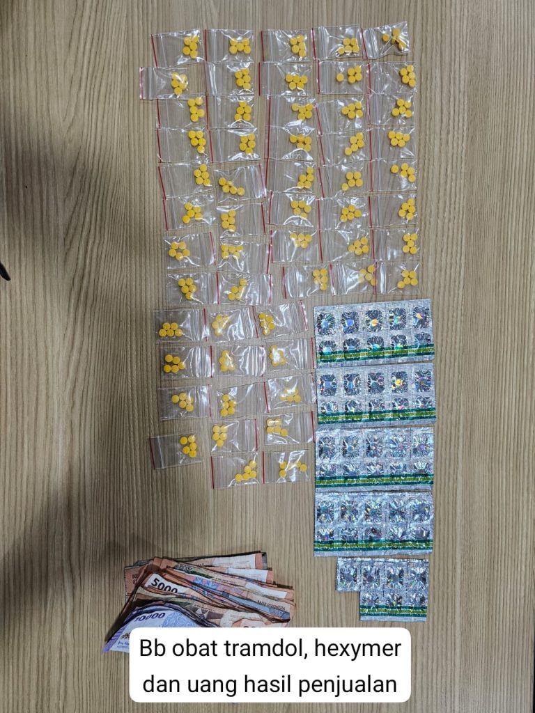Selain mengamankan kedua pelaku, Polisi juga berhasil mengamankan barang bukti berupa 5 strip obat tramadol hcl dengan jumlah 47 butir obat tramadol Hcl dan 54 plastik klip bening masing masing berisikan 5 butir obat hexymer dengan jumlah keseluruhan 270 butir.