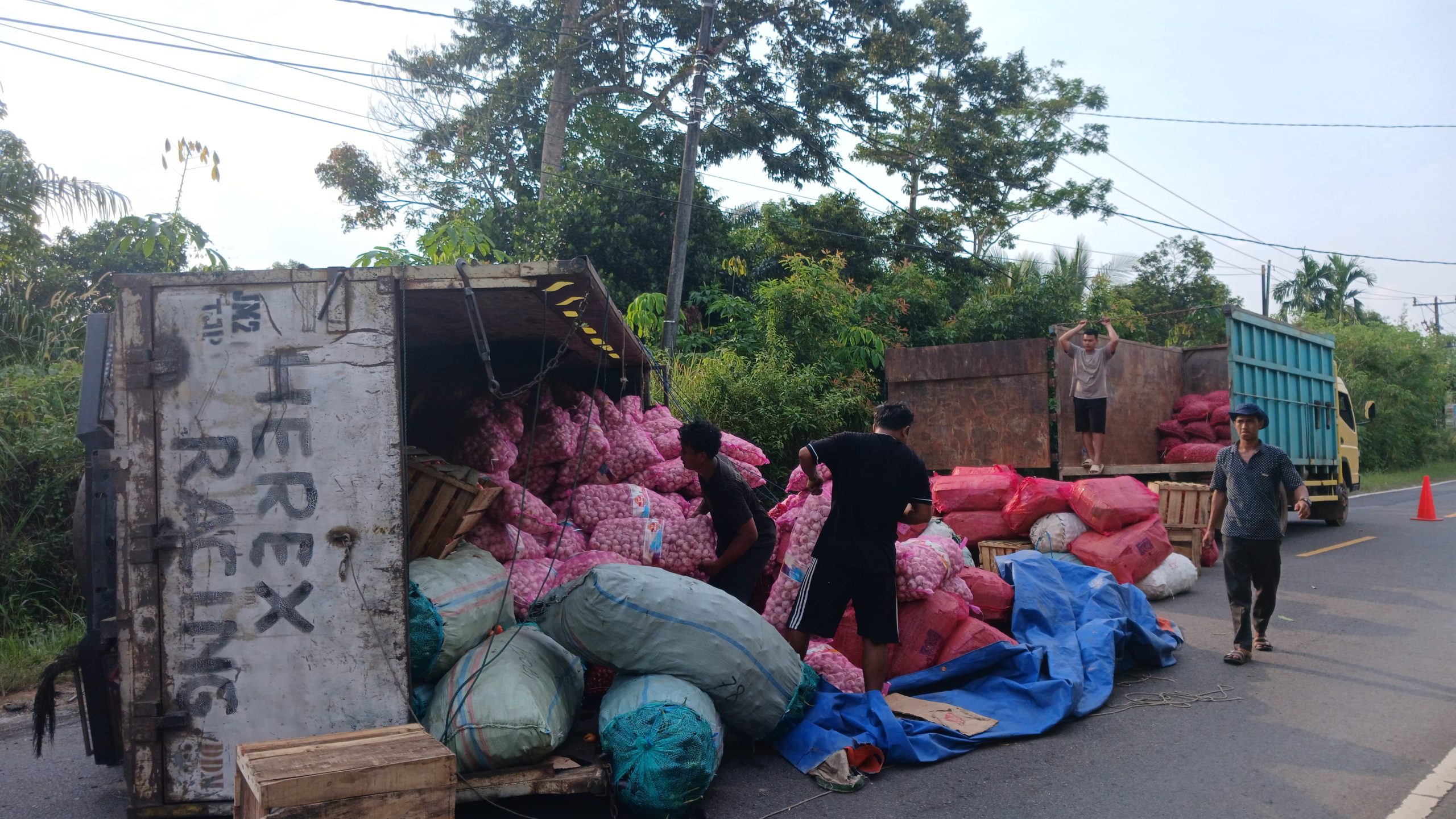 Kecelakaan tersebut melibatkan sebuah truk Mitsubishi Canter berwarna kuning dengan nomor polisi BG-8797-YE, dikemudikan oleh Rio Ananda P. (25), seorang pelajar asal Palembang. Truk bermuatan 8 ton bawang itu terguling ke arah kanan usai mengalami pecah ban depan sebelah kanan, sehingga kendaraan kehilangan kendali dan menutup lajur jalan dari arah Mentok menuju Pangkalpinang.