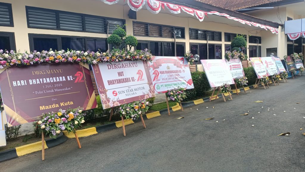 Ratusan karangan bunga berjejer rapi dan penuh warna menghiasi halaman Markas Kepolisian Resor (Mapolres) Jembrana. Ucapan selamat Hari Bhayangkara ke-79 itu datang dari berbagai pihak sebagai bentuk dukungan dan apresiasi terhadap kinerja Polri, khususnya Polres Jembrana.