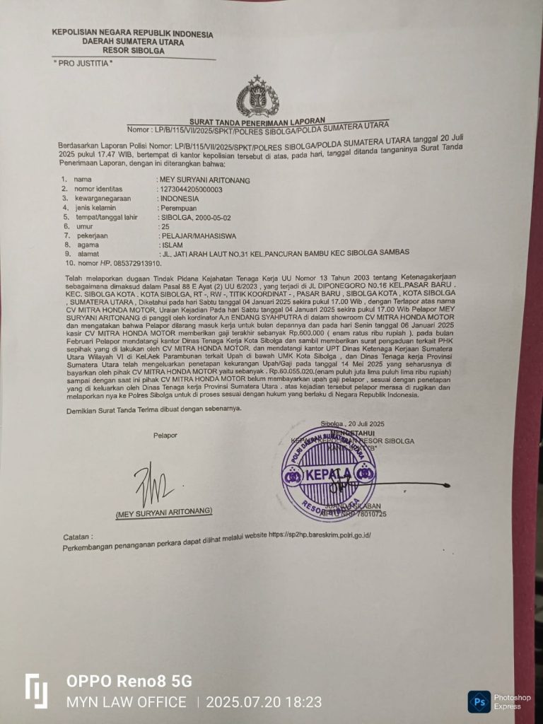Resmi di laporkan ke Polres Sibolga pada tanggal 20 juli 2025 dugaan tindak pidana kejahatan tenaga kerja. UU Ri Nomor 13 Tahun 2003 Tentang Ketenagakerjaan yang di laporkan oleh Mei Suryani Aritonang dan bersama Tim Penasihat Hukum M. Yusuf P Nasution,SH dalam laporan tersebut bahwa ada pelanggaran tindak pidana pengupahan oleh perusahaan Cv.Mitra Honda Motor Sibolga.