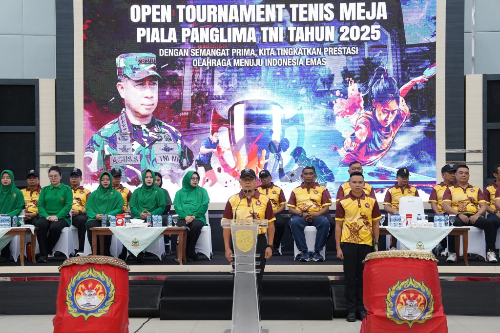 Suasana semarak mewarnai pembukaan Open Tournament Tenis Meja Piala Panglima TNI 2025 di Aula Sudirman, Makodam XII/Tanjungpura, Rabu (24/9/2025). Turnamen dibuka resmi oleh Pangdam XII/Tpr, Mayjen TNI Jamallulael, S.Sos., M.Si.