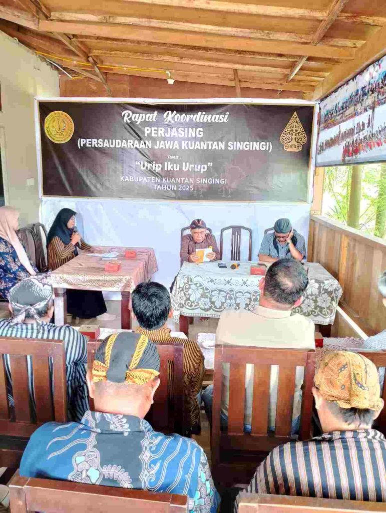 Kuantan Singingi – Pengurus Persatuan Jawa Kuantan Singingi (Perjasing) menggelar rapat koordinasi yang bertempat di Kantor Sekretariat Perjasing Kabupaten Kuantan Singingi. Rapat ini dihadiri oleh Ketua Perjasing Kabupaten Kuantan Singingi, Dewan Pembina H. Imam Suroyo, serta seluruh pengurus Perjasing dari setiap kecamatan.