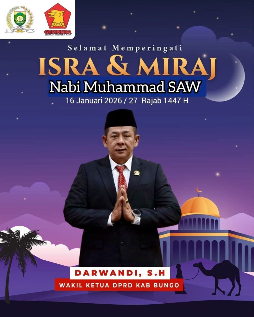 KPK Tipikor Jambi– Wakil Ketua DPRD Kabupaten Bungo, Darwandi, S.H., dari Fraksi Partai Gerindra, menyampaikan ucapan selamat memperingati Isra Mi’raj Nabi Muhammad SAW kepada seluruh umat Muslim.