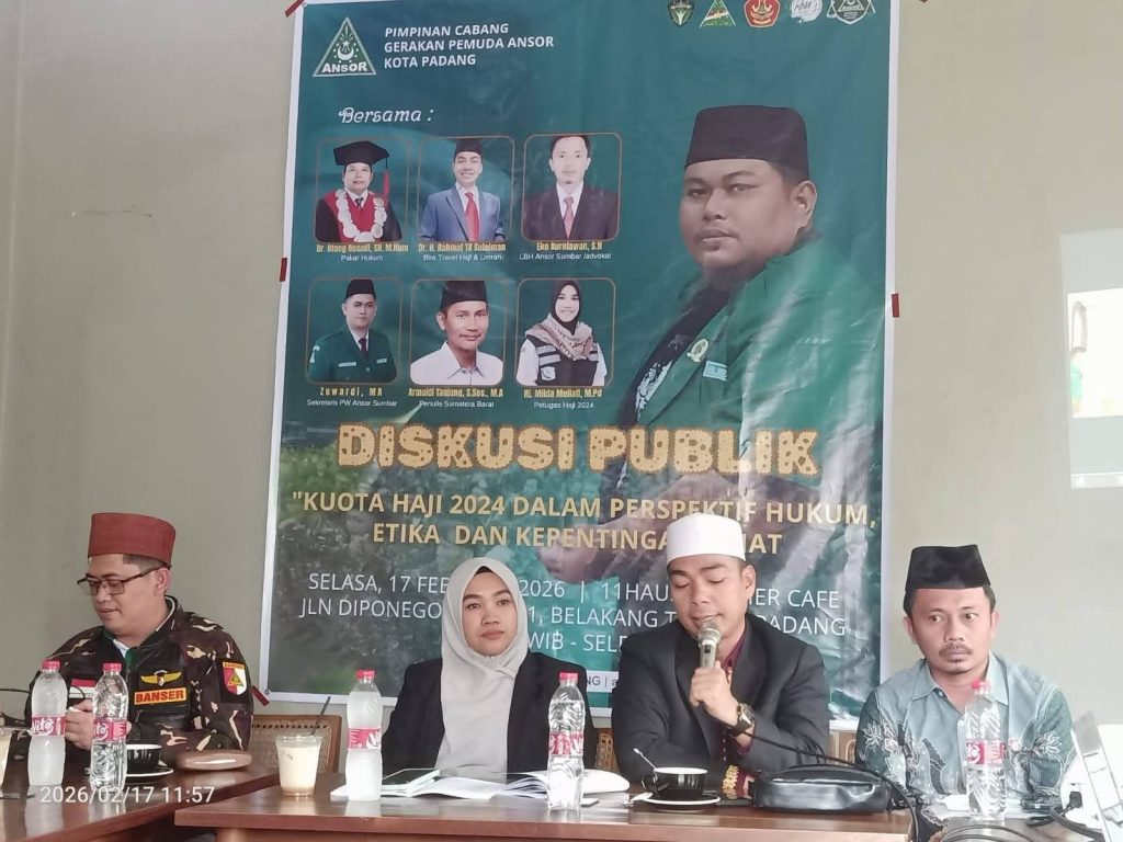 Padang, perskpknews.com – Diskusi terkait haji tidak akan pernah habisnya, mulai dari sebelum keberangkatan, hari H sampai kepulangan ke tanah air jadi hal menarik didiskusikan secara komprehensif. Hal ini jadi poin penting dari diskusi publik dengan tema “Kuota Haji 2024 Dalam Perspektif Hukum Etika dan Kepentingan Umat” yang diselenggarakan Pimpinan Cabang Gerakan Pemuda Ansor Kota Padang, Lembaga Bantuan Hukum (LBH) GP Ansor PW Sumatera Barat dan pihak terkait pada Selasa (17/2/2026) di salah satu cafe di Kota Padang. Peserta perwakilan dari PW GP Ansor Sumatera Barat, PC GP Ansor Solok, PC GP Ansor Bukittinggi, PC GP Ansor Pesisir Selatan dan sebagainya.
