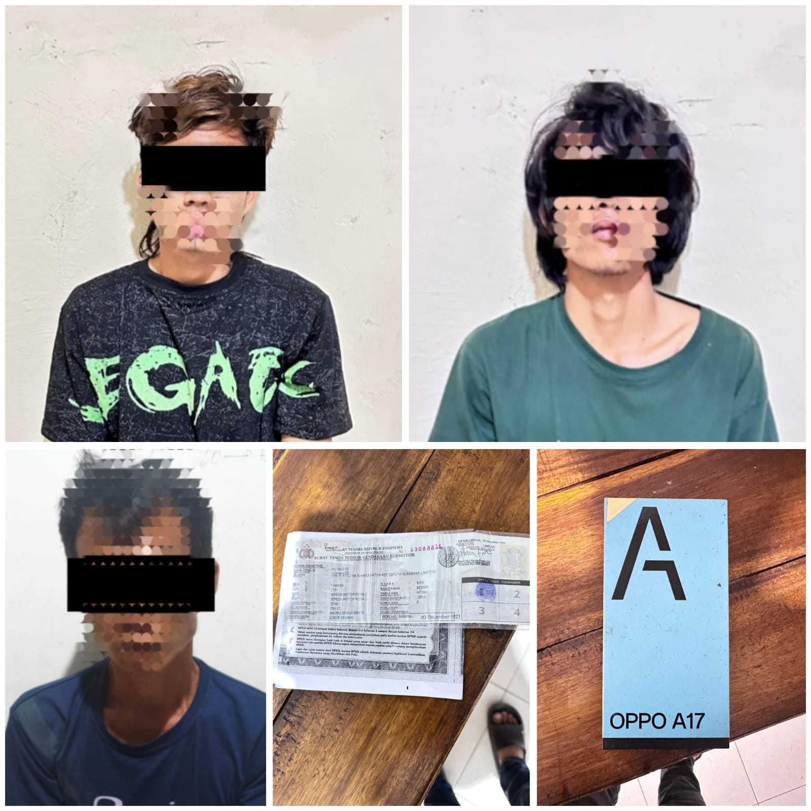Saat ini ketiga tersangka bersama barang bukti 1 Buah Kotak Handphone merek OPPO a17 Warna Biru Laut, 1 Unit Handphone merek OPPO a17 Warna Biru Laut, 1 Lembar Foto Copy BPKB dan STNK sepeda motor merek YAMAHA VIXION No. Pol BE 5930 L0 Warna Biru telah di bawa ke Mapolsek Simpang Pematang, sedangkan untuk sepeda motor hasil curian masih dalam pengejaran Anggota. Ungkap Kompol Ery