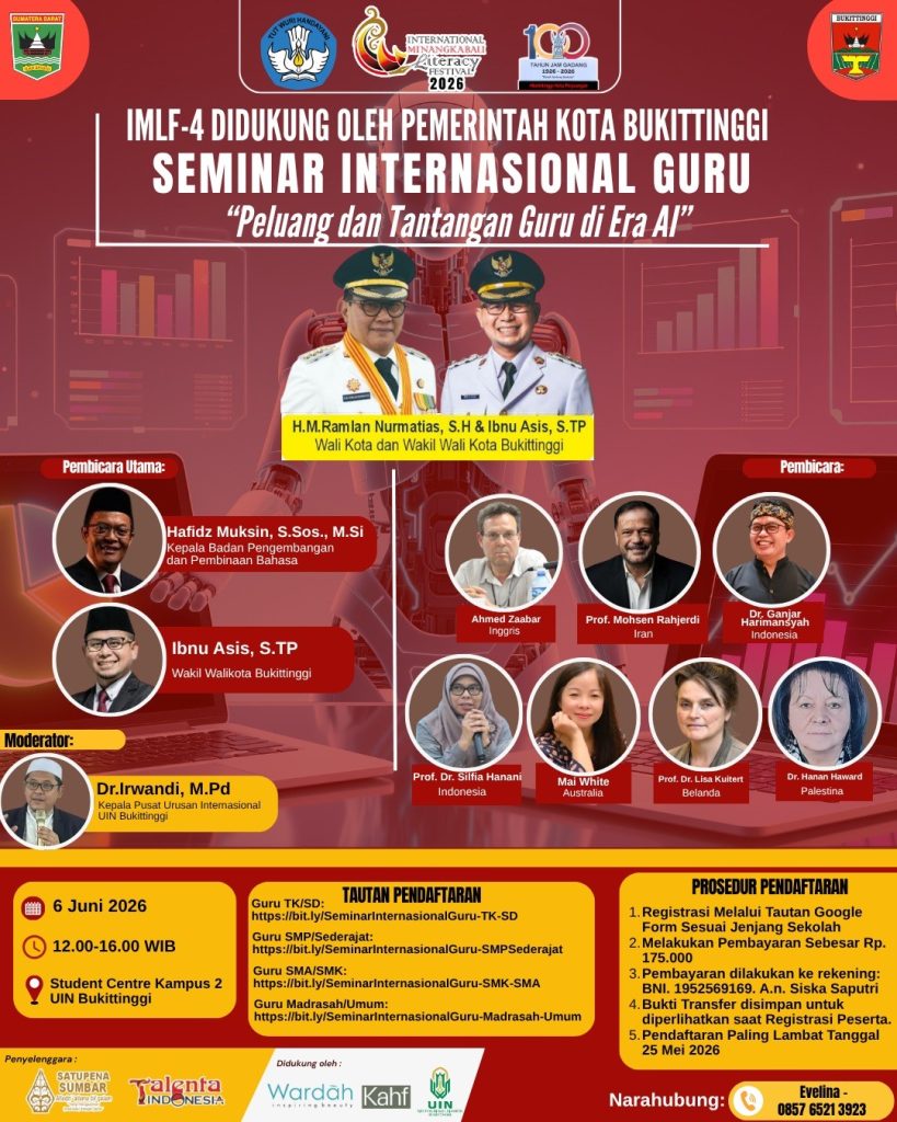 Padang, perskpknews.com – Dinas Pendidikan Provinsi Sumatera Barat dan Kantor Wilayah Kementerian Agama Provinsi Sumatera Barat menyatakan dukungan penuh terhadap penyelenggaraan Seminar Internasional Guru pada kegiatan International Minangkabau Literacy Festival (IMLF) ke-4. Seminar bertema “Peluang dan Tantangan Guru di Era Artificial Intelligence (AI)” ini akan digelar Sabtu, 6 Juni 2026 mendatang di Student Centre Kampus 2 UIN Sjech M. Djamil Djambek, Bukittinggi.
